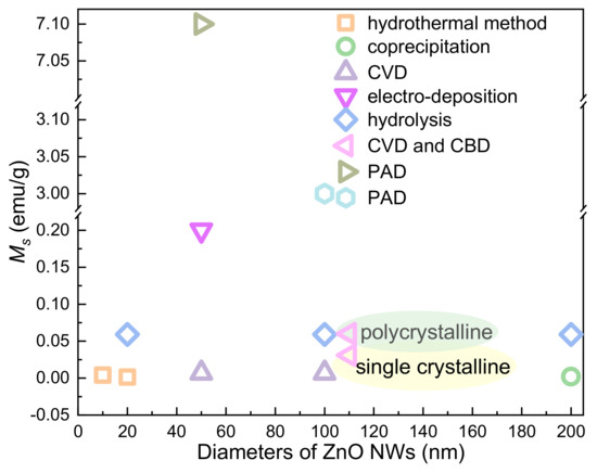 The preparation of materials has always been optimized by selecting more suitable precursors. In 2019, Zn(NO3)2·6H2O and ZnCl2 were selected as zinc sources to prepare ZnO NPs [104]. The difference of Ms was nearly four times, which may have been due to VO in the samples produced by selecting different precursors.