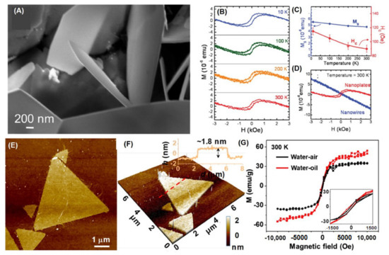 (A) ZnO nanoplates synthesized by HYT. (B) M–H curves for ZnO nanoplates. (C) The corresponding Ms and coercivities Hc are plotted in (A). (D) M–H curves for ZnO nanowires and nanoplates (Reproduced with permission from [82]. Copyright 2012, American Chemical Society). (E,F) AFM images of two-dimensional (2D) ZnO nanosheets by ILE. (G) M-H curves for 2D ZnO nanosheets (Reproduced with permission from [41]. Copyright 2019, American Chemical Society).