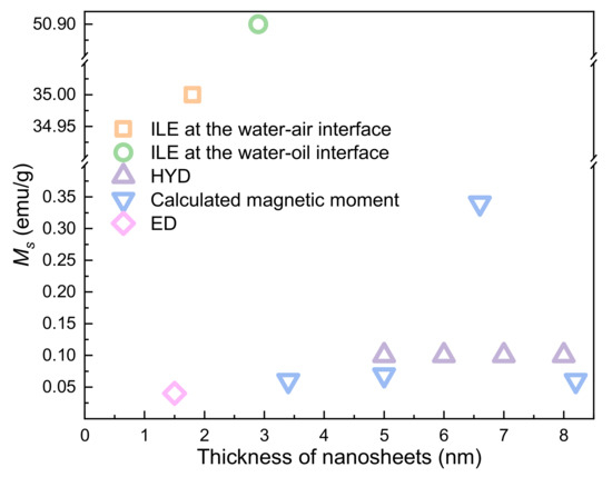 By contrast with 2D materials, ZnO nanosheets do not show obvious thickness dependence. However, ZnO nanosheets with saturation magnetization up to 50.9 emu/g have been obtained recently by ILE (Figure 10).