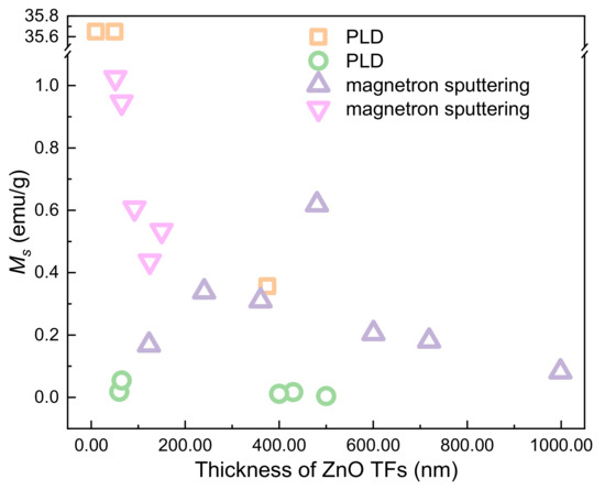 The thickness dependence of RTFM has been observed in films prepared by different experimental methods (Figure 11). The RTFM of ZnO TFs is affected by the defects on the surface of the sample or at the interface between the sample and the substrate.