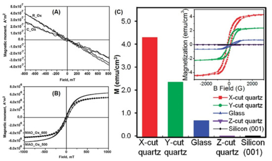 Substrates have played an important role in material synthesis [4,93,94,105,106,107,108]. ZnO TFs have been grown on single-crystalline substrates by MOCVD [93]. M–H curves show that ZnO TFs on sapphire substrate are non-ferromagnetic (Figure 12A,B). However, the structural defect located on the substrate–film interface can cause RTFM in ZnO TFs. Interestingly, different substrates have been used to fabricate ZnO TFs with the same thickness by PED [94], and their ferromagnetic behaviors are very different. The ZnO TFs on silicon substrate show stronger ferromagnetism than the others, because more VO can be created in the TFs [94]. The origin of RTFM may be VO.