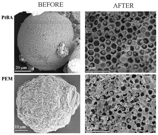 These structures are referred to as colloidosomes [33]. Some of the nanoparticles from the colloidosome’s surface can fall off after simple ultrasonication. If the immersion depth of the nanoparticles into the polymer surface was too deep, the silica nanoparticles could be removed by first treating the colloidosomes with a concentrated solution of NaOH for 24 h, which dissolved the NPs, leaving the circular traces perfectly observable with SEM; see Figure 2.