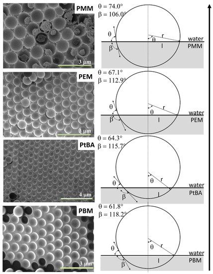 SEM images showing the circular traces left on various polymer colloidosomes, namely, PMM, PEM, PtBA, and PBM, by NP-SH, and the θ and β contact angles calculated using the following geometric relationship: .