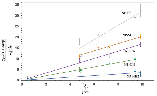 The linearized form of Equation (6) is obtained by dividing both sides of the equation by ; the system of equations corresponding to determined on different polymers with known surface energy and components and (see Table S4), and can then be solved graphically, as depicted in Figure 4:
