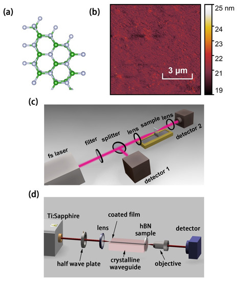 (a) Typical defect-free h-BN atomic structure; (b) AFM image of h-BN sample; the schematic of the experimental setup of (c) the Z-scan system and (d) the waveguide laser platform in this work.
