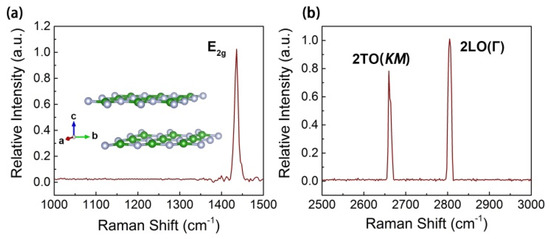 (a) First-order Raman spectrum, the inset shows crystalline structure of two layer h-BN prototype; (b) second-order Raman spectrum.