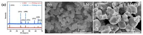 (a) XRD patterns of the LMO and LMO-B samples; the SEM images of the (b) LMO and (c) LMO-B.