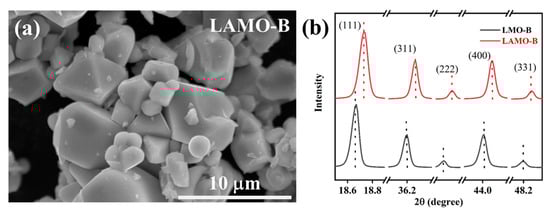 (a) Morphology of the LAMO-B sample. (b) The comparison of diffraction peaks of LMO-B and LAMO-B samples.