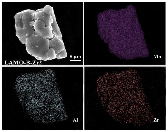 Meanwhile, it is found that the Al-doping and Li2ZrO3 coating distribute uniformly in the final samples. Taking the LAMO-B-Zr2 sample for example, the EDS mapping results exhibit uniform distribution of the Mn, Al, and Zr elements in the secondary particles as shown in Figure 4.