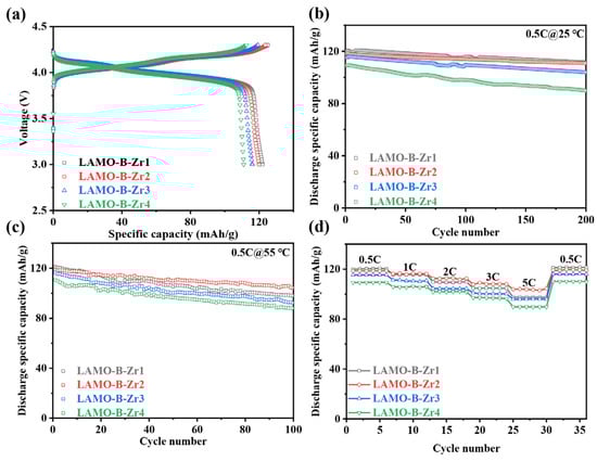Otherwise, the rate performance of the cells between 3.0 and 4.3 V (vs. Li/Li+) is shown in Figure 7d. All the cells exhibit reduced discharge capacities as the increased C-rates. Although the capacity of LAMO-B-Zr2 at 0.5C is inferior to the other cells as the lowered proportion of active substances, the discharge capacities themselves or the capacity retention of the LAMO-B-Zr2 at 1C, 2C, 3C, and 5C rates are much higher than the other control samples. Moreover, the discharge capacity of LAMO-B-Zr2 could reach up to 103.41 mAhg−1 at 5C.