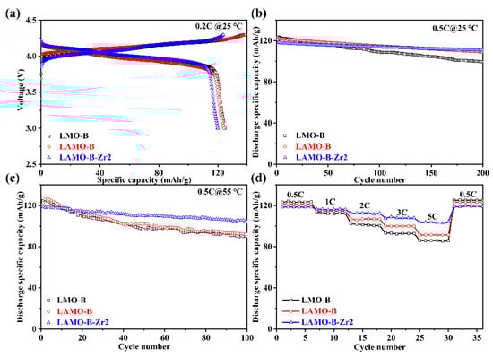 To explore the influence of the Al-doping and the Li2ZrO3 coating, the electrochemical performance of the LMO-B, LAMO-B, and LAMO-B-Zr2 samples were characterized in parallel. Figure 7a presents the first charge–discharge curves obtained at 0.2C and 25 °C between 3.0 and 4.3 V (vs. Li/Li+). There are two voltage plateaus near 4.0 V and 4.1 V, which indicates the two-stage processes of Li+ ion insertion/extraction reactions for a typical characterization of a well-crystallized spinel LiMn2O4 [,]. The initial discharge specific capacities of the as-prepared samples show a decline trend with the Al-doping and the Li2ZrO3 coating. This result is comprehensible because the percentage of Mn3+ is partially occupied by the Al-doping or lowered by the Li2ZrO3 coating.