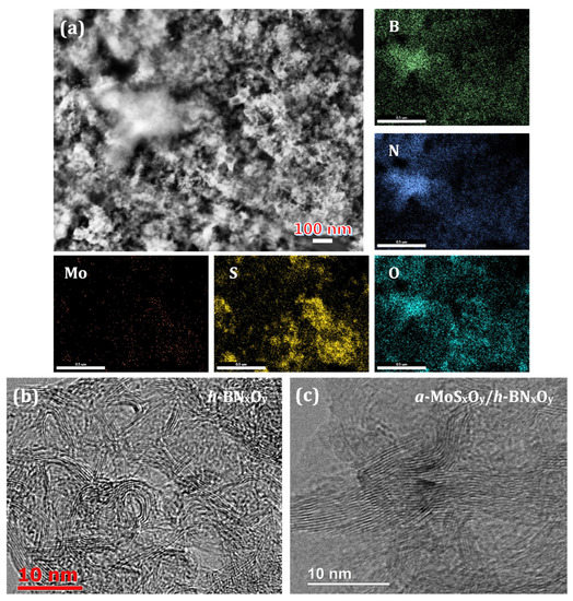 The presence of oxygen-substituted h-BNxOy phase (as evidenced from the EDXS analysis) was also confirmed by FTIR spectroscopy. The FTIR spectrum of initial h-BNxOy nanopowder exhibits strong peaks at ~1360 and ~798 cm−1, corresponding to the stretching and bending vibrations of B–N bonds in the B–N–B network [42] (Figure 2b). In addition, weak bands in the ranges of ~450–750 cm−1 and 860–1130 cm−1 are observed, which are associated with B-O vibrations. Two broad bands of moderate intensities in the range of ~3070–3500 cm−1 are attributed to the overtones of B–O and O–H vibrations. After the synthesis of a-MoSxOy/h-BNxOy nanohybrids, the FTIR spectrum changed noticeably. The bands in the high frequency range (~3070–3500 cm−1) have almost disappeared, and the shoulder at ~1400 cm−1 is not visible. A small band at about 700 cm−1 also became less pronounced. All these changes indicate that boron oxide and terminated hydroxyl groups formed as a result of partial hydrolysis of the h-BNxOy phase are reduced. However, some small peaks in the ranges of 1100–850 cm−1 and 700–400 cm−1 are still visible. We believe that these peaks are associated with the oxygen-substituted h-BNxOy phase.