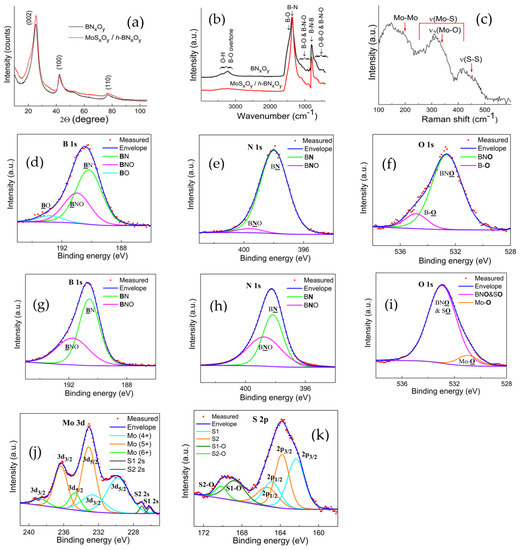 XRD patterns (a) and FTIR (b), Raman (c), and XPS (d–k) spectra of h-BNxOy and a-MoSxOy/h-BNxOy materials. h-BNxOy—(a,b,d–f), a-MoSxOy/h-BNxOy—(a–c,g–k).