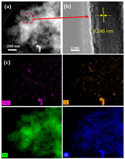 A HAADF-STEM image with the corresponding EDXS elemental maps of a-MoSxOy/h-BNxOy nanohybrids is shown in Figure 1a. The distributions of boron, nitrogen, and oxygen correlate with each other, indicating the presence of h-BNxOy phase. Areas rich in molybdenum, sulfur and oxygen also overlap, implying their chemical bonding. The high resolution transmission electron microscopy (HRTEM) image confirms that the initial h-BNxOy consists of curled flakes with an average thickness of several atomic layers and a length of ~20 nm (Figure 1b). It can be seen that after synthesis, the full width at the half maximum (FWHM) of the XRD peak increases slightly, which indicates a decrease in the average size of h-BNxOy nanocrystals (Figure 2a). We believe that this is due to hydroxylation and partial etching of h-BNxOy nanocrystals in the alkaline synthesis medium (pH 8) at 250 °C [41]. It should be noted that no diffraction peaks from molybdenum sulfide are seen in the XRD pattern. According to the ICP AES analysis, the concentration of molybdenum sulfide is 5 wt.%. The crystalline molybdenum sulfide in such an amount should be detected by XRD. The absence of reflection from molybdenum sulfide suggests an amorphous state. For proof, the nanohybrids were vacuum annealed at 600 °C for 1 h. The HAADF-STEM image and the corresponding EDXS elemental maps are presented in Figure 3. After annealing S, Mo, and O are concentrated in separate nanoparticles due to segregations. Rod-like precipitates observed in Figure 3a, are identified as crystalline nanoparticles with a characteristic d spacing of 0.246 nm, typical of the MoS2 phase (Figure 3b).