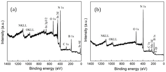 The survey XPS spectra of h-BNxOy and a-MoSxOy/h-BNxOy materials placed on an In substrate are shown in Figure 4. In addition to the small XPS C 1s peak from adsorbed carbonaceous species, the h-BNxOy XPS spectrum shows O 1s, N 1s, and B 1s peaks as well as In substrate peaks. The XPS spectrum of a-MoSxOy/h-BNxOy nanohybrids additionally contains Mo and S. Peaks of Cl are not observed.