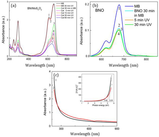 UV-vis absorption spectra of MB water solution (a). 1—MB without UV-illumination, 2—MB after illumination for 30 min, 3—MB + a-MoSxOy/h-BNxOy (denoted as Cat) after 30 min exposure in the dark, 4–7—Cat after illumination for 5, 15, 30, and 60 min. UV-vis absorption spectra of MB + h-BNxOy suspension (b). UV-vis absorption spectra (c) of h-BNxOy (curve 1) and a-MoSxOy/h-BNxOy (curve 2) nanopowders suspended in methanol. The inset shows the Tauc plot and band gap values for h-BNxOy (curve 1) and a-MoSxOy/h-BNxOy (curve 2).