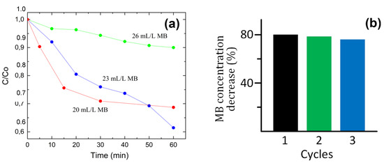 The reusability of the photocatalyst was evaluated from three successive photocatalytic tests during 90 min of UV irradiation of solutions with a MB concentration of 23 mL/L (71.9 mmol/L). According to the obtained results, the photocatalytic activity reaches 80 wt. % and slightly decreases after three cycles, which indicates good stability and the reusability of the material (Figure 6b).