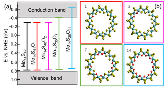 The calculation of the band structure shows that the band gap of the isolated Mo14S42 cluster is 1.08 eV, which is insufficient for the photocatalytic splitting of water. With an increase in the fraction of impurity oxygen, the band gap increases and in the case of Mo14S28O14 (33%) it is 1.38 eV, which satisfies condition (8). However, in addition to the band gap, the photocatalyst must meet certain requirements for the position of the edges of the valence and conduction bands. To satisfy conditions (9) and (10), their positions must be respectively lower and higher than the potentials of the reactions catalyzed by the generated electron and hole. For each of the structures, the HOMO and LUMO values were calculated according to work [62] and correlated with the equilibrium potentials of hydrogen and oxygen evolution for pH 7. The found positions of the conduction and valence bands relative to the standard hydrogen electrode are −0.62 eV and 0.74 eV, respectively (Figure 7a).