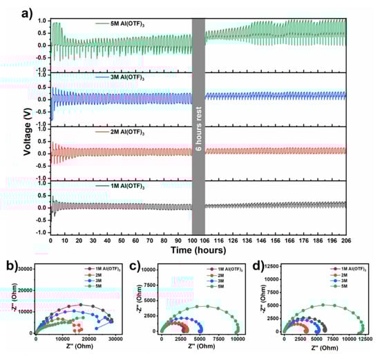 To understand the interfacial resistances contributing to the polarization and their dependence on the salt′s concentration, we probed the system at different time-points of the plating-stripping cycling (0 h, 100 h and 200 h), using electrochemical impedance spectroscopy (EIS). Immediately after the assembly of the cells (at 0 h), the EIS shows extremely high resistances (Figure 1b). At this stage, the interface between the Al anode and the electrolyte is very immature and the inductive loops at low frequencies are indicative of its modification through ion adsorption processes [39,40]. After 100 h of cycling (Figure 1c), lower resistances were seen. Both the 1M and 2M stand at around 3000 Ω, while the 3M and 5M show 5000 Ω and 10,000 Ω, respectively. By leaving the cells to rest for 6 h and cycling them for an additional 100 h (Figure 1d), a resistance of around 6500 Ω is measured for the 1M electrolyte, while the 2M and 3M have resistances of 3000 Ω and 5000 Ω, respectively. The 5M resistance increases to 12,000 Ω. From this, it is clear that the interface between the Al plate and the electrolyte is heavily dependent on the salt′s concentration and immersion time. If the concentration is too high or too low, the interface appears unstable as observed for the 1M and 5M electrolytes. On the other hand, both 2M and 3M appear stable and have low polarization values. In fact, the 2M has the lowest charge-transfer resistance and it is stable for more than 200 h of cycling (Figure 1a,d). Hereafter, in order to balance the interface stability, charge-transfer resistance and operational voltage window, a 2M electrolyte was used.