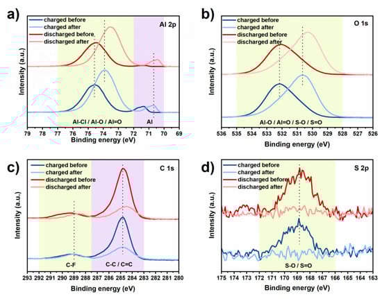 The Al 2p analysis was complemented by the O 1s study (Figure 2b). Again, a BE shift was observed as a function of depth. The peaks are asymmetric and can originate from the electrolyte (S–O/S=O present in CF3SO3−), the Al3+ solvation shell (Al–O) and the native aluminum oxide (Al–O/Al=O). The etching step resulted in a ~2 eV shift to lower BE. This is explained by the elimination of the IL component and subsequent exposure of the aluminum oxide, in agreement with the Al 2p findings. After etching, the visibly higher BE of the charged state is explained by an increased presence of solvated Al ions. Not surprisingly, the C 1s and S 2p spectra are less informative (Figure 2c,d, respectively). The C 1s spectrum consists of two main peaks. The smaller one, in the 291–288 eV range, is attributed to the C–F from the electrolyte and has constant intensity. The dominant peak, in the 287–283 eV range, originates from the organic component of the ionic liquid, [EMIm] (i.e., C–C/C=C), that integrates the AlCl3-IL pretreatment [44]. This is also the region of adventitious C (284.8 eV). Upon etching, its intensity decreases significantly, as expected. Likewise, the S 2p peaks (from the SO3- of the Al(OTF)3 electrolyte) vanish after etching. Following the peak shift analysis, the elements identified with XPS were quantified, before and after etching (Table 1).