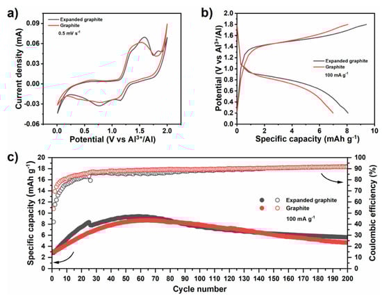 Electrochemical performance of the graphite and expanded graphite cathode: (a) cyclic voltammetry, (b) charge−discharge voltage profiles and (c) cycling stability with Coulombic efficiency.