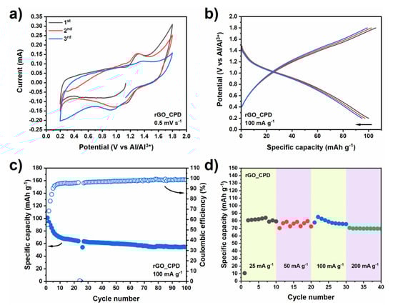 As seen in Figure 4, the supercritically-dried rGO (rGO_CPD) exhibits vastly superior performance than both graphite and expanded graphite. Its cyclic voltammogram (Figure 4a) shows broad at peaks 1.0 V and 1.3 V for discharge and charge, respectively. These potential values are similar to those referred to above, for the graphite and expanded graphite. The intensity of the rGO_CPD peaks is relatively lower but the area enclosed by the cyclic voltammogram curves is larger, indicating an increased pseudocapacitive contribution to the charge-storage mechanism [48,49]. The voltage curves (Figure 4b) show sloping profiles, instead of plateaus, in agreement with the pseudocapacitive character of the electrode and justifies the remarkable increase in capacity (by one order of magnitude), with the initial capacity at ~100 mAh g−1. Furthermore, the rGO_CPD′s cycling stability and the coulombic efficiency are also superior (Figure 4c), with 77% of capacity retention between 10th and 100th cycles at a constant coulombic efficiency of ~98%. Finally, its rate capability (Figure 4d) yields similar capacities for different current densities, confirming the resilience of the rGO_CPD cathode. Such a response speaks to the stability and efficiency of this system. It also demonstrates that “opening up” the graphitic structure (by increasing the surface area and inducing mesoporosity), successfully overcomes the inherent limitations of the large ion size. Ultimately, the ~20 nm mesopores network of the rGO_CPD enables a better wetting of the cathode mass as well as facilitating the access of the Al ions to redox-active sites [19,47].
