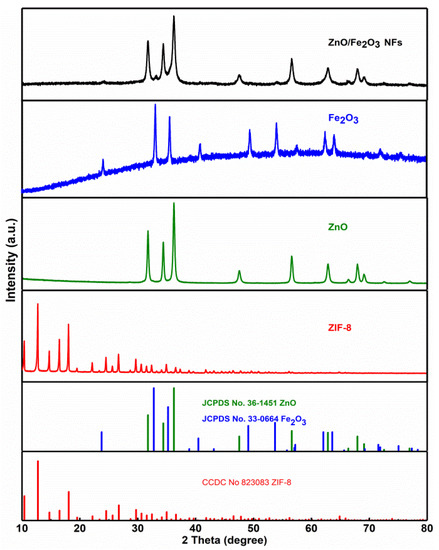 XRD patterns of the ZIF-8, ZnO, Fe2O3 and ZnO/Fe2O3 NFs as indicated.