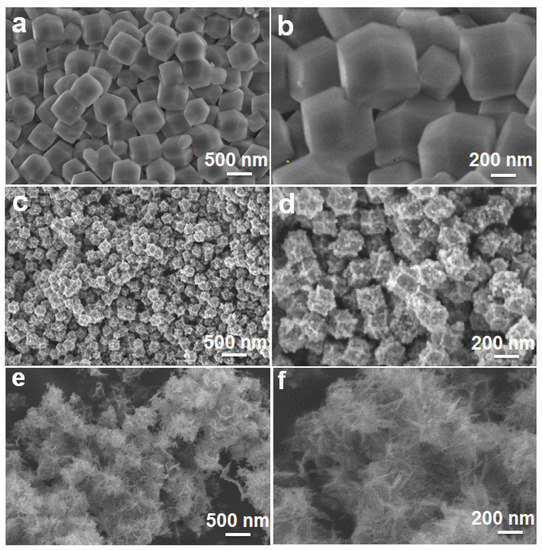 The morphological and structural information of the as-prepared samples were further characterized by the FESEM observation, as demonstrated in Figure 3. Typically, the ZIF-8 precursor displays a well-defined rhombic dodecahedral shape with sharp edges and smooth surfaces, as well as a relatively uniform size distribution of 500 nm on average, as seen in Figure 3a,b. After further thermally annealing the ZIF-8 at 420 °C, ZnO is obtained. Although it still retains the polyhedral shape of the ZIF-8 precursor, the size shrinks to 200 nm (Figure 3c). This is probably attributed to the pyrogenic decomposition. Moreover, compared to the smooth surface of the ZIF-8 precursor, the converted ZnO appears to possess a rough surface, and many tiny nanoparticles of ~20 nm in size can be clearly found on the surface (Figure 3d). Afterwards, the cautious dropwise addition of FeSO4 into the ZnO suspension at 0 °C inevitably results in the partial collapse of the polyhedral structures (Figure S1, ESI). With the subsequent annealing process at 500 °C, a more serious structure collapse occurs, and the resulted ZnO/Fe2O3 sample exhibits the fluffy flower-like architecture, as shown in Figure 3e,f.