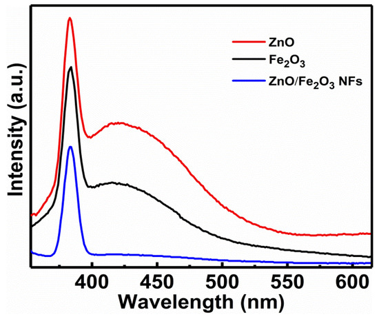 Although the BET surface area of a photocatalyst has been considered as an important factor in determining its photocatalytic activity, the separation efficiency of electron-hole pairs of the composite photocatalyst used in the research is always the key factor. Normally, the PL is recognized as an effective approach to obtain valuable information about the migration and recombination efficiency of the photo-generated electron-hole pairs, as the recombination of excited electrons and holes in a semiconductor is responsible for its PL emission [45,46,47]. The observation of stronger PL intensity indicates a greater prevalence of electron-hole recombination, while an increase in electron-hole recombination will decrease the concentrations of reductant/oxidant and dye degradation rate meanwhile. Figure 8 illustrates the RT PL emission spectra of the as-fabricated samples at an excitation wavelength of 300 nm. As is evident, the bare ZnO and Fe2O3 both show sharp UV emission peaks mainly located at 370 nm and broad visible emission peaks with the wavelength range from 400 to 550 nm, while the ZnO/Fe2O3 NFs just demonstrate a sharp UV emission peak centered at ~390 nm. The sharp UV emission peaks are normally associated with the band-edge emission resulting from the recombination of free excitons [48,49]. The generation of wide emission peaks in the visible-light area is generally attributed to the defects of metal atoms and oxygen vacancies during the crystal growing process [50,51]. The PL intensity of ZnO/Fe2O3 NFs is even lower than that of pure ZnO and Fe2O3, which definitely supports one fact that the recombination of photo-generated charge carriers is significantly inhibited for the case of ZnO/Fe2O3 NFs.