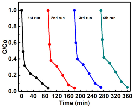 The excellent reusability of any photocatalyst is also recognized as a key factor for its practical applications. To evaluate the photocatalytic stability of ZnO/Fe2O3 NFs, the photocatalytic activities of ZnO/Fe2O3 NFs are investigated by circulating runs in the degradation of the MB under UV light irradiation. As can be observed from Figure 10, the shrinking in degradation rate is still kept within ~1% even up to four consecutive cycles under the same photocatalytic conditions. The decrease in the degradation efficiency is probably attributed to the loss of photocatalysts during the cycling process. Additionally, the XRD pattern of ZnO/Fe2O3 NFs after the four-cycle photocatalytic degradation of the MB presents no obvious change in comparison with its original pattern (Figure 11), which further verifies the remarkable stability of the resultant ZnO/Fe2O3 NFs. The observation here implies that ZnO/Fe2O3 NFs own superior cycling stability, and no obvious photocorrosion takes place during the photocatalytic degradation of the MB molecules, which is of particular significance for its commercial applications.