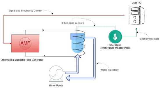 The MHT system used in this study consists of an AMF generator connected to a coil, inside of which there is the sample holder. The latter is connected to a water pump so that a continuous flow of water is pumped through. As for the sample’s temperature measurement, we used fiber optic sensors to detect and plot the temperature rise and fall curves (see Figure 1).