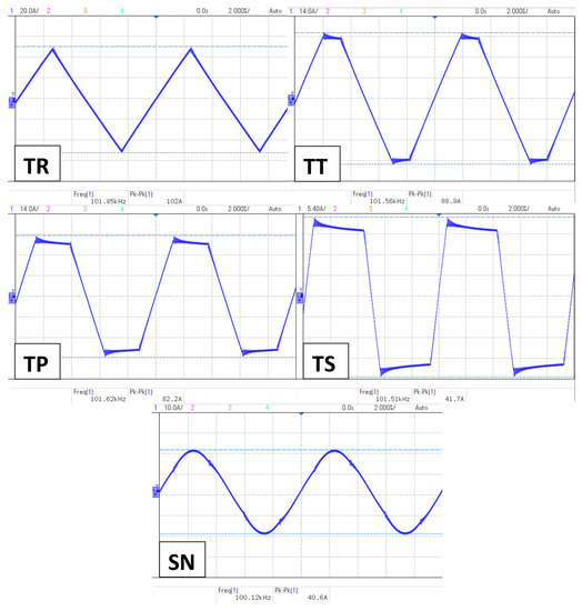 The AMF generator used for the experiments of this article is a full bridge-inverter-based device [28] designed and developed in our laboratory. It is able to generate 4 unconventional signals in addition to a 5th sinusoidal (SN) for comparison (see Figure 2). The 4 unconventional signals are: