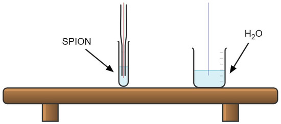 In our experimental protocols, three measurements are taken simultaneously, as shown in Figure 3. Looking at the SPION tube, we notice a Pasteur pipette placed inside the sample tube. It is to keep the fiber optic right in the center of the sample because, based on Wildeboer et al. [31], the thermal conductivity variate between the center, lower and higher parts of the sample. Furthermore, since the fiber optics are eventually cables that might curve, we decided to place a Pasteur pipette to keep it straight and fixed in the middle of the sample.