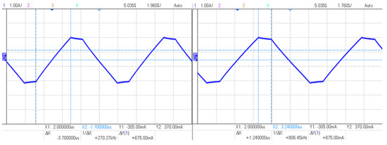 The rise-time of the positive ramp, steady-state and fall-time of the negative ramp of each waveform was measured using an oscilloscope (see Figure 6), according to which the calculations were made to develop the factor of each waveform. The measurements were repeated at all frequencies to make sure the generation is stable at all frequencies. The slope factor values are represented in Table 1.