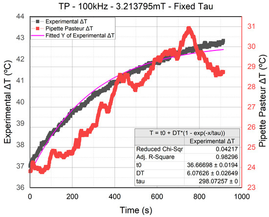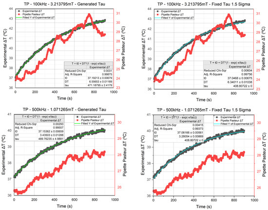 The graphs in Figure 7 represent the data of the temperature sensors found in the sample (in gray) and Pasteur Pipette (in red). The third sensor’s measurement was not included in the graphs since it is an ambient temperature sensor placed in a water cup measuring a fixed value at 23 °C (see Figure 4). We have four different graphs; all of them are measurements of the TP signal. However, the two on top are experiments conducted at 100 kHz and mT, whereas the two on the bottom are conducted at 500 kHz mT. As for the fitting curves, the green fitting is the one made using the generated by OriginPro, whereas the cyan fitting is the one made using the chosen following the cast-out approach. As we can see, the difference between the generated and fixed was insignificant, which allowed us to move forward and use the fixed value (in cyan) on the rest of the temperature curves. All the fittings showed slight differences between their generated fitting and the fixed fitting, which led us to conclude that the fixed is valid.