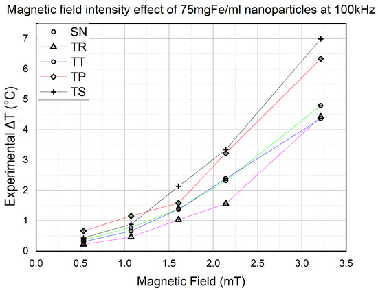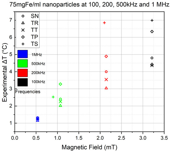 In Figure 13, the experiment results using 75 mgFe/mL are represented in black, whereas the ones conducted using mgFe/mL are represented in red, and every waveform used in the experiments is represented by its own sign.