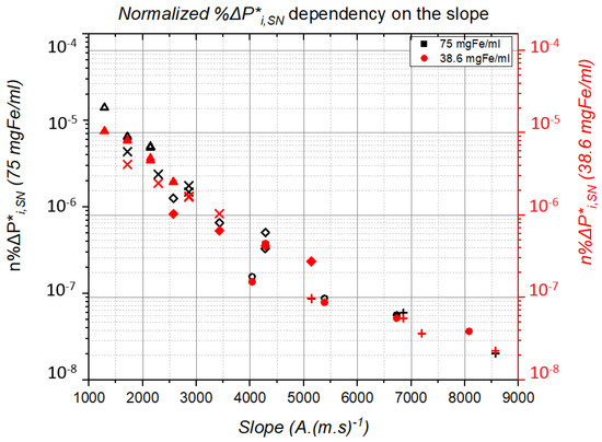 In order to determine the dependency of NPs’ power dissipation on the signal slope, we have to go back to the Rosensweig equation in Equation (1). We set our focus upon the magnetic field intensity and the frequency f while neglecting the other variable. The thermal power depends on the product of f and to the power two, which means if normalized by dividing to the product of f· to the power two, the thermal power should be essentially almost constant since the NP denominator varies slightly with the frequency. Next, we go back to the formula in Equation (2), and we also focus on the same variables. Looking at these two equations, we notice that by dividing the thermal power from Equation (1) by the product of · from Equation (2) to the power of two, we can determine the relationship between the former and the waveform slope.