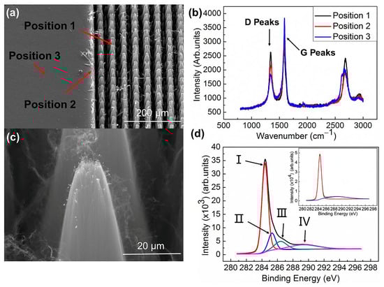 XPS showed that in addition to C, there is a small amount of O in the raw VACNT. Compared with the raw VACNT, the O concentration in the UV laser-processed VACNT was significantly increased, and there is a small amount of N and other trace elements in the air. The C 1s, O 1s, and N 1s peaks of processed VACNT and the C 1s and O 1s peaks of unprocessed VACNT are clearly visible in the XPS survey scan spectrum (see Supplementary Materials Figure S8a). The O concentration in the raw VACNT is 0.97%; the O and N concentrations in the processed VACNT are 7.54% and 0.88%. We examined the C 1s XPS peaks for processed (Figure 2d) and raw VACNT (see Supplementary Materials Figure S8b). As shown in Figure 2d, peak I represents the graphite-like C–C bonds at 284.4 eV, the peaks at 285.3 eV (II) and 286.4 eV (III) are the different types of the C–N bones, peak II corresponds to the SP2 trigonal C–N bonding, and peak III corresponds to SP3 tetrahedral C–N bonding, while the last peak (IV) at 289.3 eV is attributed to C–O type bonds [31,32,33,34]. The C 1s peaks of the raw VACNT only show graphite-like C–C bonds and C–O type bonds. O in the unprocessed samples may be due to the oxidation of the VACNTs during post-growth air exposure [32].