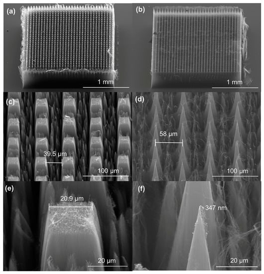 (a) A typical UV laser-processed cuboid array with a side length of about 20 μm and (b) 500 nm consisting of 1089 elements. (c) An enlarged view of the processed array showing the formed tips of about 20 μm and (d) about 500 nm. (e) A single tip in the array with a radius of curvature of 20.9 μm and (f) 347 nm.