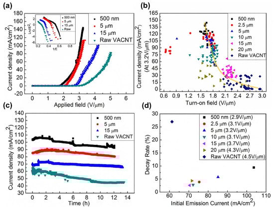 (a) Current density–applied field curves of the raw VACNT film; the cone arrays of the tip size are about 500 nm, 5 μm, and 15 μm, and the illustration is Forwer–Nordheim plots. (b) The statistical diagram of the relationship between the open field strength and the current density of the unprocessed samples and the cone array samples with different tip sizes. (c) Current–time stability curves of the raw VACNT film; the cone arrays of the tip size are 500 nm, 5 μm, and 15 μm. (d) The relationship between the current decay rate (12 h) and the initial current of raw samples and cone array samples with different tip sizes was studied. (The calculated emission is 4 mm2 from (a–d)).