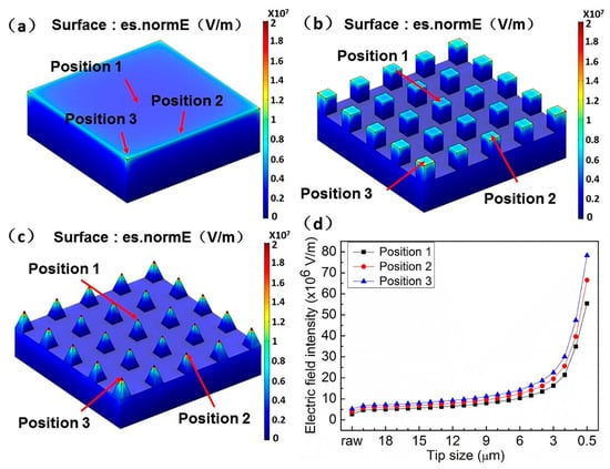 A three-dimensional numerical calculation by Comsol Multiphysics software was carried out. According to the calculation results of the three models, the screen effect of the nanocone array with a tip size of 500 nm is the weakest (Figure 5c), which is followed by the arrays of tip size of 20 μm (Figure 5b), and the strongest screening effect is the raw VACNT film (Figure 5a). The nanocone arrays that have a tip size of 500 nm have more regions with higher electric field intensity, which are followed by the arrays with a tip size of 20 μm. According to the actual situation, each carbon nanotube has a certain field screen effect on the surrounding carbon nanotubes, and the strength of the field screen effect is related to their height and the distance between them [38]. The grooves formed by laser processing of the cone arrays with tip sizes of 500 nm and 20 μm help to reduce the field screen effect and make the edge and tip carbon nanotubes obtain higher electric field strength. Moreover, the sharp area is more conducive to the increase in electric field strength. Figure 5d shows the calculation results of the electric field strength at positions 1 (the center point of the upper surface of the center array corresponds to the center point of the upper surface of VACNT), 2 (the center point of the upper surface of the third array of edges corresponds to the position of the same coordinates of VACNT), and 3 (the center point of the upper surface of the corner array corresponds to the same coordinate position of VACNT) of the cone arrays of tip size from 0.5 to 20 μm and the raw VACNT. It shows the increasing trend of the electric field at positions 1, 2, and 3 with the decrease in tip size and their comparison with unprocessed VACNT. It also shows the comparison results at different positions (positions 1, 2, and 3).