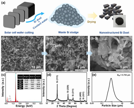 Figure 1a shows a schematic illustration of the yielding process of NSD produced as a by-product from the manufacturing process of the Si wafer for a solar cell. The Si sludge with coolant solution is formed during the sawing process of the Si ingot, to make the Si wafer. After drying process under inert conditions, NSD powder can be obtained. As shown in Figure 1(b1–b3), NSD has a block-like morphology with a particle size below 1 μm. The distribution of the particle size of NSD was measured by particle-size analysis (Figure S1). The size of Si dust is ranging from 200 nm to 10 μm.