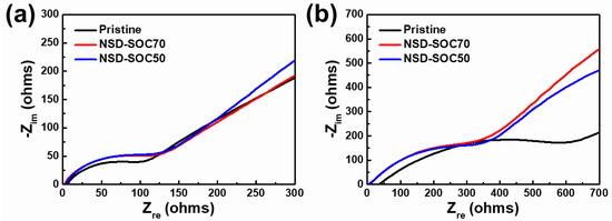 To compare the electrochemical performances between electrodes, electrochemical impedance spectroscopy (EIS) tests were carried out after 1 and 100 cycles in the frequency range from 250 kHz to 10 mHz with an amplitude of 5 mV. Nyquist plots obtained from EIS are plotted in Figure 3. The x-intercept of a semicircle indicates an Ohmic resistance and the diameter of the semicircle corresponds to a charge transfer resistance (Rct) [21,22]. The initial charge transfer resistances of pristine NSD, NSD-SOC70 and NSD-SOC50 electrodes are 95.5 Ω, 98.9 Ω and 117.4 Ω, respectively. The highest charge transfer resistance of NSD-SOC50 is related to the partial activation of anode. The changing ratio of charge transfer resistance of each electrode before and after cycling is significantly different. After 100 cycles, the pristine NSD has the highest charge transfer resistance (365.1 Ω) in comparison with NSD-SOC70 (190.1 Ω) and NSD-SOC50 (183.7 Ω). The huge increase in resistance indicates the degradation of the pristine NSD electrode (i.e., material fracture, electrode crack, unstable SEI, electrolyte depletion), which is attributed by the volume change of the Si electrode. Considering this result, the step to modulate the utilization degree of electrodes facilitates the stable cycling of electrodes as well as stabilizes the SEI layer during cycling.