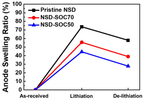 In order to investigate the swelling behavior in terms of utilization degree, we measured the thickness change of each electrode after lithiation (Figure 4). After lithiation, the NSD electrode exhibited 73.7% of electrode swelling when compared to the as-received electrode. On the other hand, NSD-SOC70 and NSD-SOC50 showed a reduced swelling ratio of 55.5% and 44.4%, respectively. Transmission electron microscopy (TEM) results also corroborated that the electrode with controlled utilization degree maintained its structural integrity, even after a cycle. These results can be inferred from the morphology of electrode, i.e., material crack (Figure S1). In general, the reduced expansion of electrodes can minimize the pulverization of electrode components and provide an improved cycle stability. As shown in Figure 4, each electrode was still expanded even after the full delithiation. Pristine NSD, NSD-SOC70 and NSD-SOC50 had electrode-swelling ratios of 57.9%, 38.9% and 27.8%, respectively. This is because the delithiated Si electrode could not recover its original configuration due to the irreversible structural transformation. However, an interesting thing to note is that electrodes with controlled utilization degree are relatively more beneficial to maintaining the electrode structure than the fully charged NSD. It is reported that the structure distortion of electrodes accelerates a fading capacity. Moreover, the electrode swelling could raise safety issues caused by separator deformation or battery package breakage [23,24]. The enhanced structure resilience of electrodes with a controlled utilization degree can address the concerns with regard to capacity fading and safety problem.