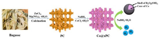 In recent years, relatively inexpensive transition metals [12] (such as Co [13], Ni [14], Cu [15] and Fe [16]) have been observed to exhibit excellent performances in catalytic sodium borohydride hydrolysis, especially metal nanoparticles prepared with transition metals as catalysts. In particular, Co-based catalysts are considered to be particularly attractive in the hydrolysis of NaBH4 for hydrogen production due to their high activity and relatively low cost [17,18,19]. Metal catalysts are usually prepared by chemical reduction using NaBH4 and ammonia borane. However, metal nanoparticles are prone to agglomeration during the reduction and catalytic process, resulting in reduced catalyst activity and poor cycle stability [20]. In order to prevent agglomeration, the most used method is to choose suitable support materials, including SiO2 [21], γ-Al2O3 [22], hydroxyapatite [23], carbon materials [24,25], etc. In particular, the addition of appropriate promoters could be used to enhance the dispersibility of Co nanoparticles and increase the surficial active sites [18]. Therefore, using the reduction method, the surface of supporting materials could be loaded with reduced Co nanoparticles, so that the agglomeration of the composite catalyst is inhibited and its specific surface area increased. Compared with unsupported metal catalysts, catalysts composed of support materials and metal particles have a larger specific surface area [26], which increases the contact area between metal particles and NaBH4 aqueous solution. In addition, supporting materials increase the stability of metal particles, greatly increasing the durability [27,28,29]. Among the supporting materials mentioned above, carbon materials such as porous carbon (PC) are the most attractive support due to their chemical inertness and large surface area [24]. At present, the reported porous carbon materials [30] loaded with Co nanoparticles mainly include carbon nanotubes, graphene, activated carbon, organic drugs [31] and polymer materials [13]. Among them, carbon nanotubes, graphene, activated carbon and polymer materials are relatively expensive. Meanwhile, most organic drugs are also not conducive to practical promotion because they contain a certain level of toxicity. Therefore, PC prepared from biomass is an excellent candidate as a support because it not only has a wide range of raw materials (especially biomass such as bagasse) but is also simple to prepare.