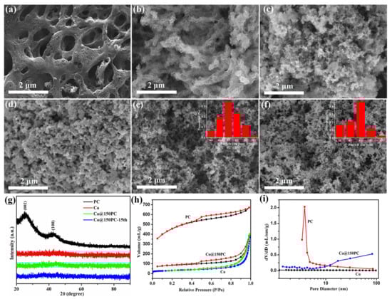 SEM images of PC (a), Co (b), Co@50PC (c), Co@100PC (d), Co@150PC (e) and Co@200PC (f). XRD patterns of the as-prepared catalysts (g). N2 adsorption–desorption isotherms (h) and corresponding BJH pore-size distribution plots (i) of PC, Co and Co@150PC. The insets in (e,f) are the size distribution of metal Co nanoparticles.