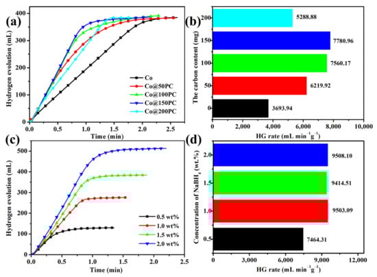Hydrogen production rate of the as-prepared samples with (a,b) amount of PC added in Co, (c,d) NaBH4 concentration.