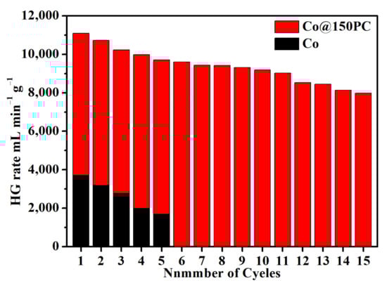 In addition to having excellent catalytic activity, low cost and environmentally friendly properties, the hydrolysis catalyst is also required to have good stability. Therefore, the stability studies of Co@150PC catalyst were conducted. The histogram of the hydrogen generation rate and the different cycle times was drawn to study the changes in the hydrogen generation rate during the stability test (Figure 6). Obviously, the hydrogen generation rate decreased slowly as the number of tests increased. The hydrogen production rate of the Co@150PC catalyst is 7982.54 mLH2∙min−1∙gCo−1 at the 15th cycle with a 72.0% hydrogen generation rate of the initial cycle retained. Compared with previous reported values (Table 2), the cycle stability of Co@150PC is significantly improved and the decline in performance is relatively small compared with the Co-based catalysts supported by other carbon materials. To prove that the presence of PC could effectively improve the cycling performance of the catalyst, we performed a repeatability study on the pure Co catalyst under the same conditions (Figure 6). The hydrogen production rate catalyzed by neat Co was 1684.30 mLH2∙min−1∙gCo−1 after five hydrolysis cycles, which was only 45.6% of the hydrogen generation rate of the first cycle.