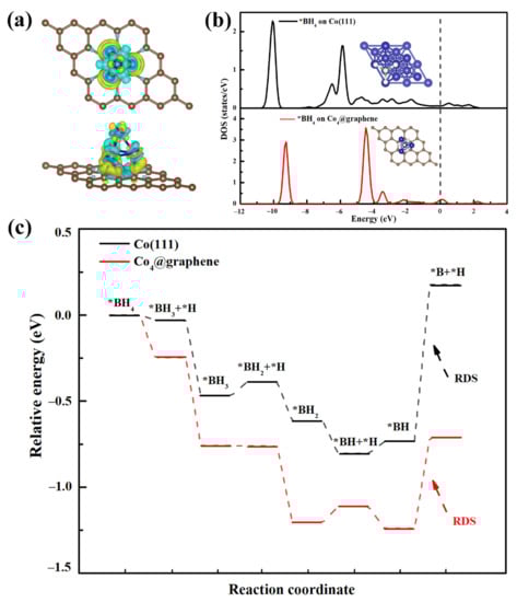 By constructing a model of Co4 clusters on graphene (named Co4@graphene) to perform DFT calculations, we can further understand the catalysis of the Co@xPC structure in the NaBH4 hydrolysis process. Although the models of Co4 clusters and graphene in this experiment are much smaller than the observed Co@xPC nanoparticles, the relative energy of the NaBH4 hydrolysis process can be discussed. Therefore, the sequential dissociation of BHx (x = 0→4) molecules on the Co(111) and Co4@graphene surface was calculated. First, the structure optimization showed that Co4 clusters could be anchored on the graphene surface to maintain a stable structure with an adsorption energy of −3.34 eV. As shown in different charge density maps (Figure 8a), there is a charge accumulation between graphene and the Co4 cluster. The graphene gains 0.794 electrons from the Co4 cluster, indicating that the redistribution of the electron potential of the Co4@graphene structure is weakening the inert B-H bond and activating [BH4]−. From the density of states (DOS) plots, an increased electron state of *BH4 DOS at the Fermi level on Co4@graphene compared with the Co(111) surface can be observed (Figure 8b), indicating that the electrons in Co4@graphene can efficiently back donate to the unoccupied orbital of [BH4]−, thus activating the [BH4]− molecule. According to Figure 8c, the rate-determining step (RDS) is the BH dissociation step common to both systems in the pathways. Obviously, H abstracting from * BH on the Co(111) and Co4@graphene surface is endothermic, which requires 0.911 and 0.527 eV of energies, respectively. Hence, the above results fully suggested that the Co4@graphene structure is favorable to the dissociation of [BH4]− molecules.