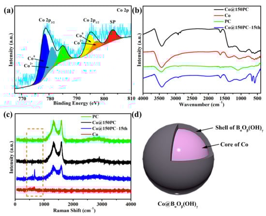 Co 2p XPS spectrum of Co@150PC-15th (a). FT-IR spectra (b), Raman spectra of the as-prepared catalysts (c). Schematic diagram of the structure of Co@BαOβ(OH)γ, a core-shell structure with metallic cobalt as the core and (poly)borate as the outer shell (d).